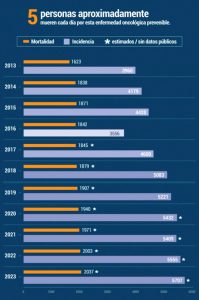 La Sociedad Anticancerosa de Venezuela (SAV) estimó que 1881 mujeres murieron por cáncer de cuello uterino en el país y se detectaron 5409 casos nuevos en un año según su Pronóstico de mortalidad e incidencia por cáncer del 2021. En un análisis preliminar, la asociación civil calculó que la incidencia aumentaría con 5707 casos nuevos de cáncer de cuello uterino y 2037 mujeres pueden morir por la enfermedad en 2023. Para 2022 se estimaron 5555 casos detectados
